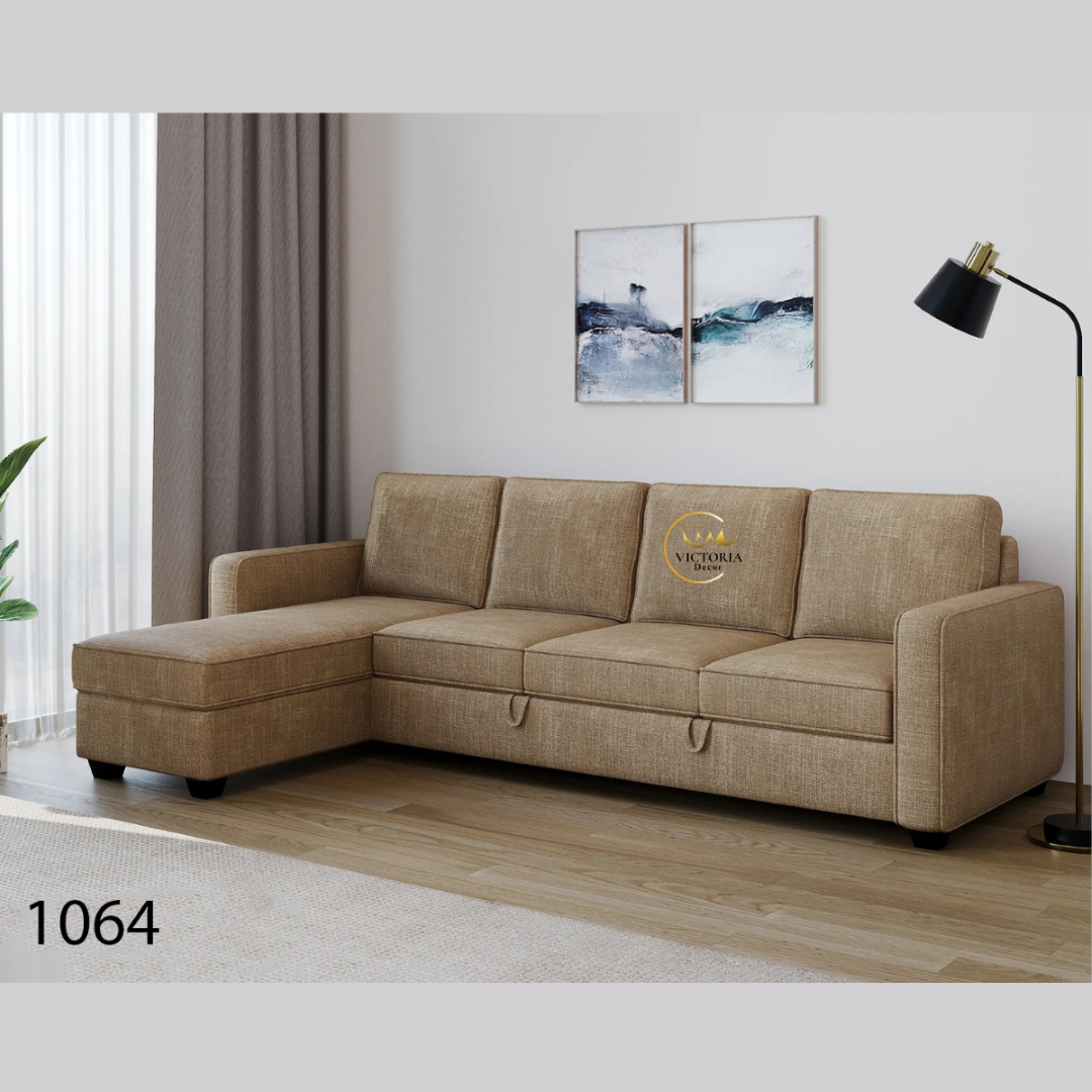 5-seater L-shaped sectional sofa in textured beige, built with durable wood and cushioned with 40-density foam for lasting comfort.
