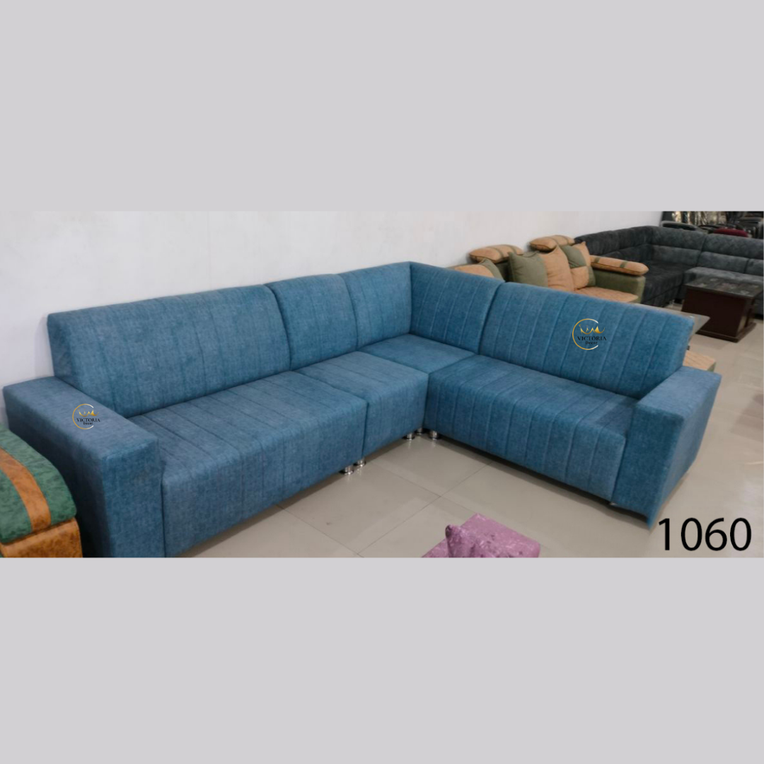 6-seater L-shaped sectional sofa in textured blue, built with durable wood and cushioned with 40-density foam for lasting comfort.